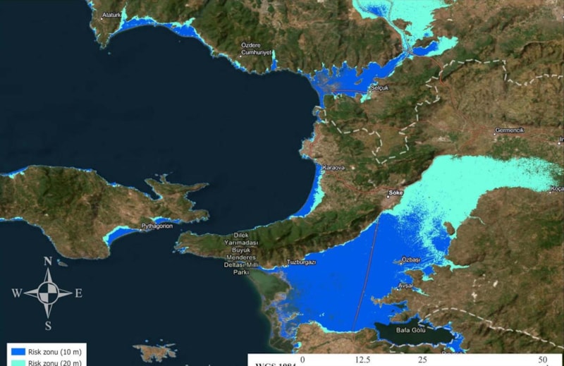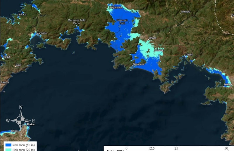 Ege kıyılarını değerlendirsek Foça'dan başlayarak Bayraklı, İzmir ve Urla Yarımadası etrafından 10 metrelik ve 20 metrelik risk zonları geniş alanlar kaplıyor. İleriye gittiğimiz zaman Kuşadası, Latmos Körfezi, karşısında Sisam Adası, aşağıya indimiz zaman Didim, Güllük Körfezi, Gümüşlük, Turgutreis, Bodrum, Akyaka, Ören, Turgut, Marmaris, Köyceğiz, Sarıgerme ile Fethiye'nin 5 ve 10 metrelik deniz taşkınları risk bölgesinde yer aldığı görülüyor.