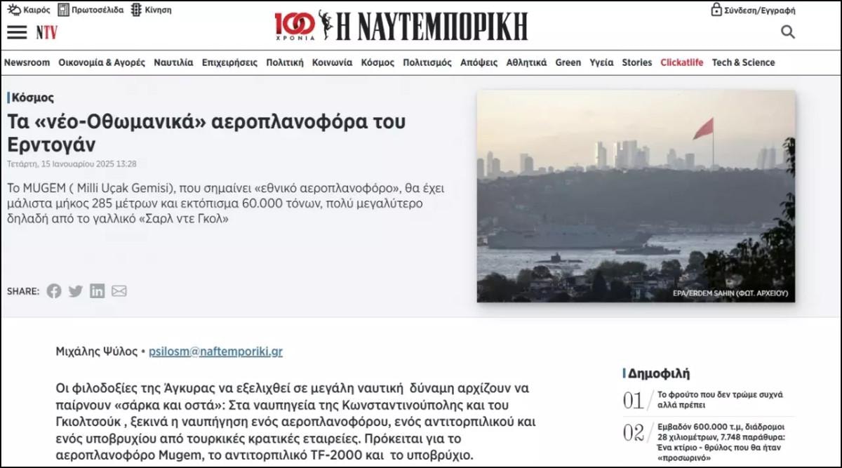 Yunan gazetesi Naftemporiki, Türkiye'nin üretimi için startını verdiği MUGEM milli uçak gemisini haberleştirdi.