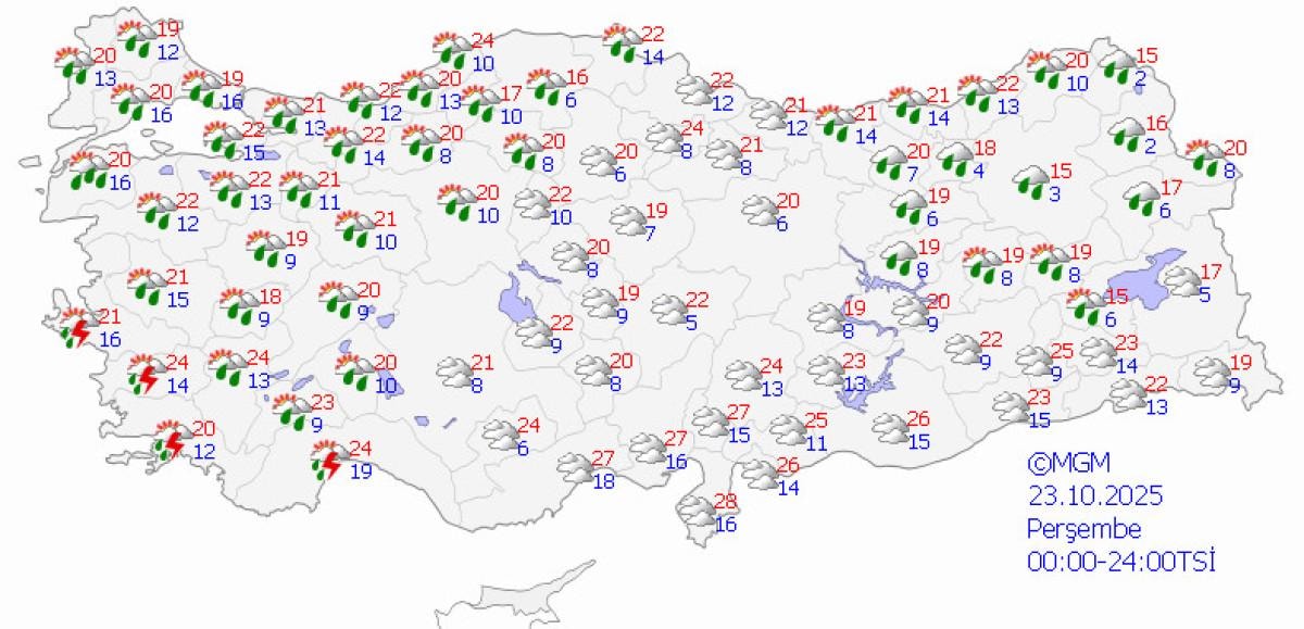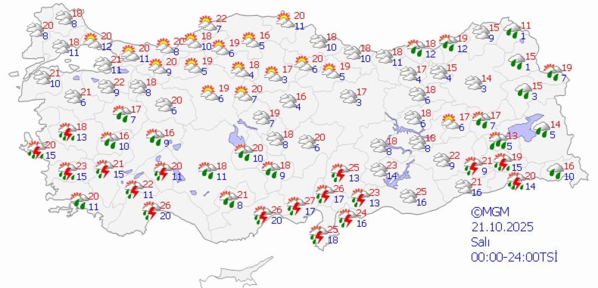 - Meteoroloji, Ege, Akdeniz ve Marmara bölgelerinde sağanak yağış uyarısı yaptı.