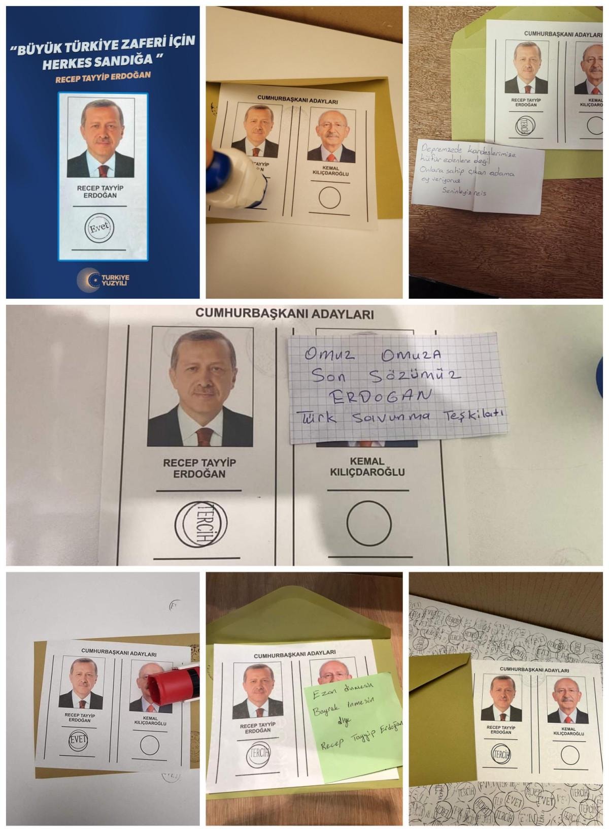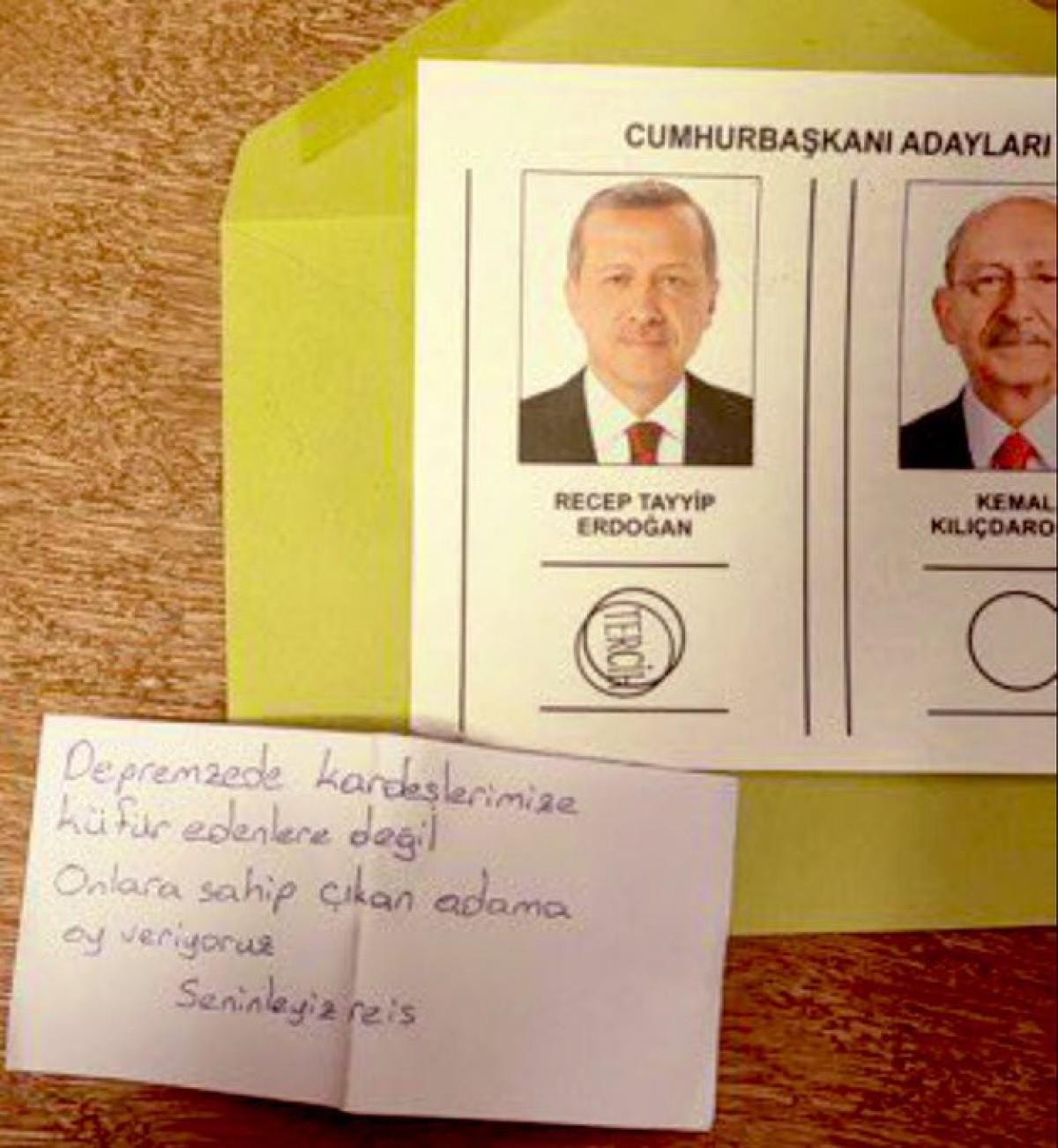 Bu mesajlardan birisi de depremzedeler için geldi. Oy kullanan bir vatandaşın yazdığı kağıtta, "Depremzede kardeşlerimize küfür edenlere değil onlara sahip çıkan adama oy veriyoruz. Seninleyiz reis" ifadeleri yer aldı.