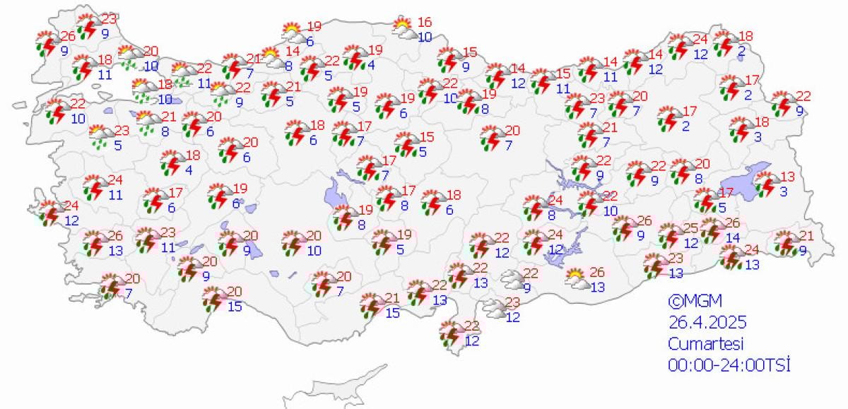 26 Nisan 2025 Cumartesi, Türkiye genelinde hava parçalı bulutlu ve yer yer yağışlı olacak.