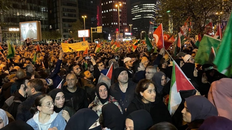 İsrail'in abluka altındaki Gazze'de el-Ehli Baptist Hastanesi'ni bombalamasının ardından Bursa'da vatandaşlar, 15 Temmuz Demokrasi Meydanı'nda toplandı.
