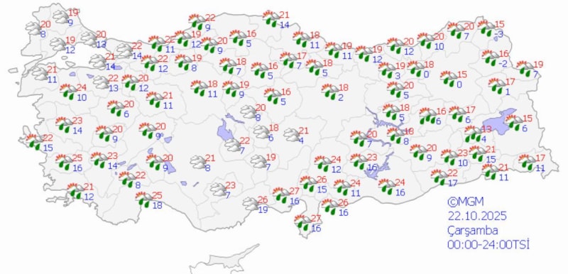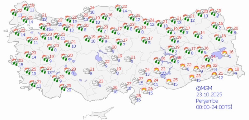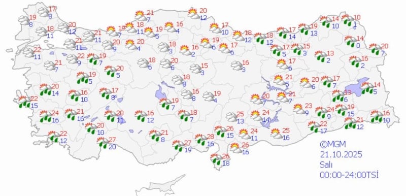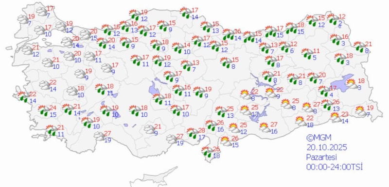 Meteoroloji Genel Müdürlüğü'nün verilerine göre yurt genelinde parçalı bulutlu bir havanın hakim olması bekleniyor. Güney Ege'den Doğu Anadolu'ya kadar birçok bölgede yerel yağışlar öngörülüyor.
