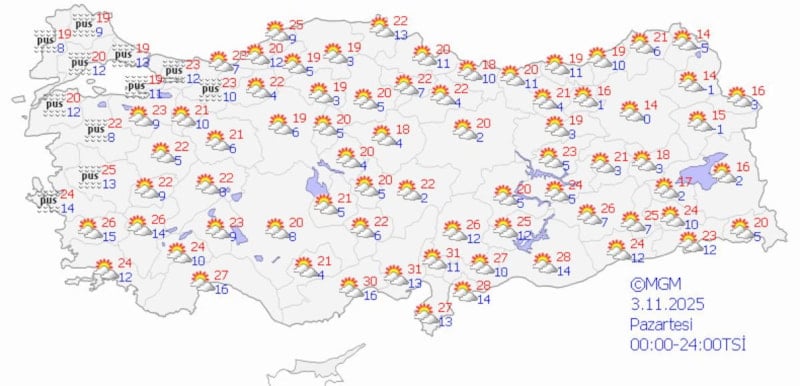 Meteoroloji Genel Müdürlüğü'nün son verilerine göre sıcaklıklar mevsim normallerinde seyrederken, özellikle iç ve batı bölgelerde sis ve pus etkisi bekleniyor. Yurt genelinde bulutlu hava hakim olurken, bazı bölgelerde yerel yağışlar öngörülüyor.