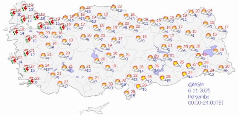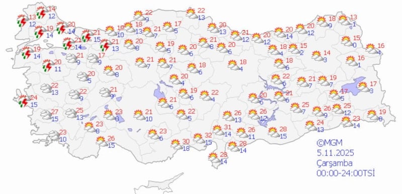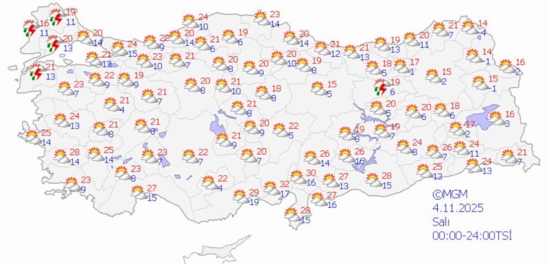 Meteoroloji Genel Müdürlüğü'nün (MGM) verilerine göre, ülke genelinde az bulutlu ve açık hava hakimiyeti sürecek, sıcaklıklar ise mevsim normallerinde seyredecek.
