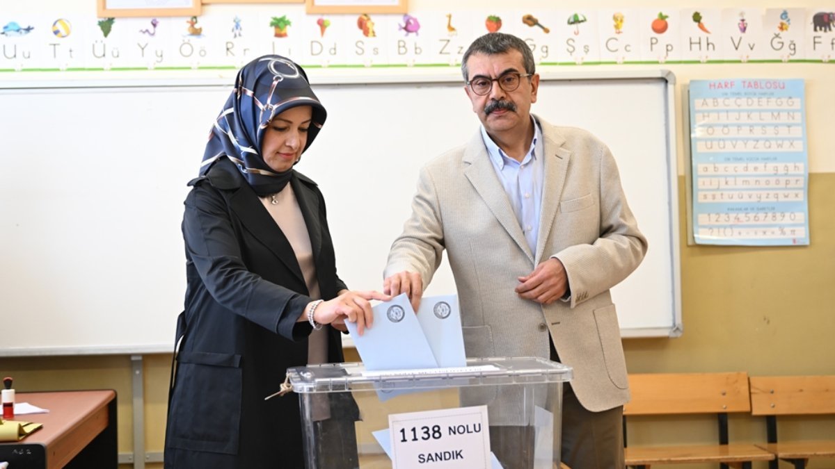 Milli Eğitim Bakanı Yusuf Tekin, eşi Ayşe Tekin ile birlikte Mahalli İdareler Genel Seçimleri'nde oyunu kullanmak için Ankara'daki Gölbaşı Hacılar İlkokulu'na geldi.