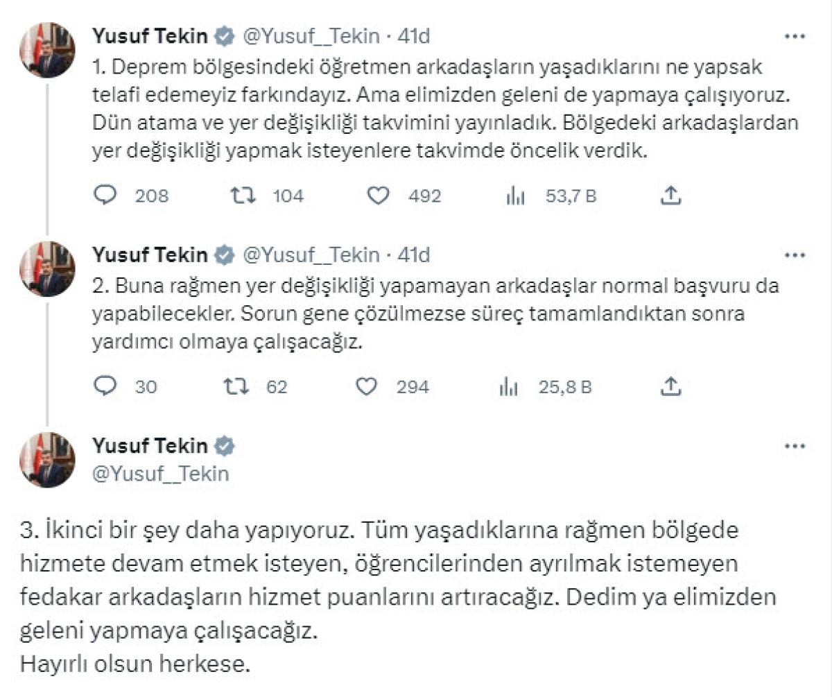 Tekin, sosyal medya hesabından yaptığı açıklamada şu ifadeleri kullandı: