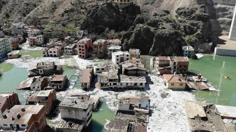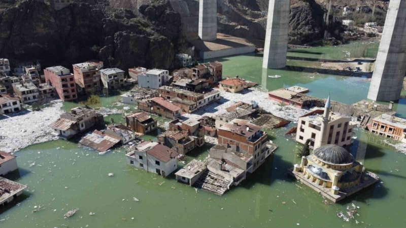 Büyük kısmı su altında kalan eski ilçe merkezinde, güvenlik gerekçesiyle araç ve yaya girişine izin verilmiyor.