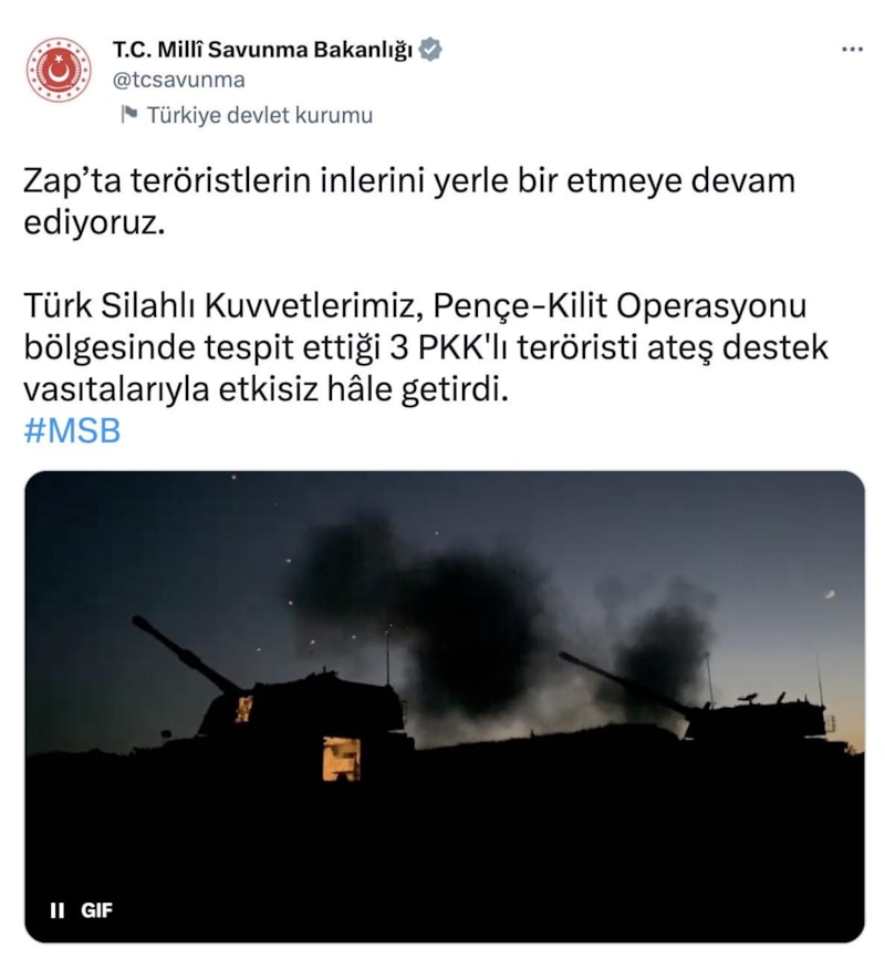 "Zap’ta teröristlerin inlerini yerle bir etmeye devam ediyoruz. Türk Silahlı Kuvvetlerimiz, Pençe-Kilit Operasyonu bölgesinde tespit ettiği 3 PKK'lı teröristi ateş destek vasıtalarıyla etkisiz hale getirdi."