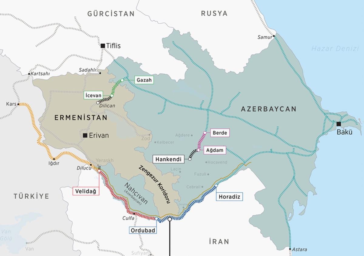 Türkiye sınırındaki Azerbaycan'a bağlı Nahçıvan Özerk Cumhuriyeti ve Azerbaycan arasında sadece Ermenistan'ın Zengezur bölgesi kaldı.