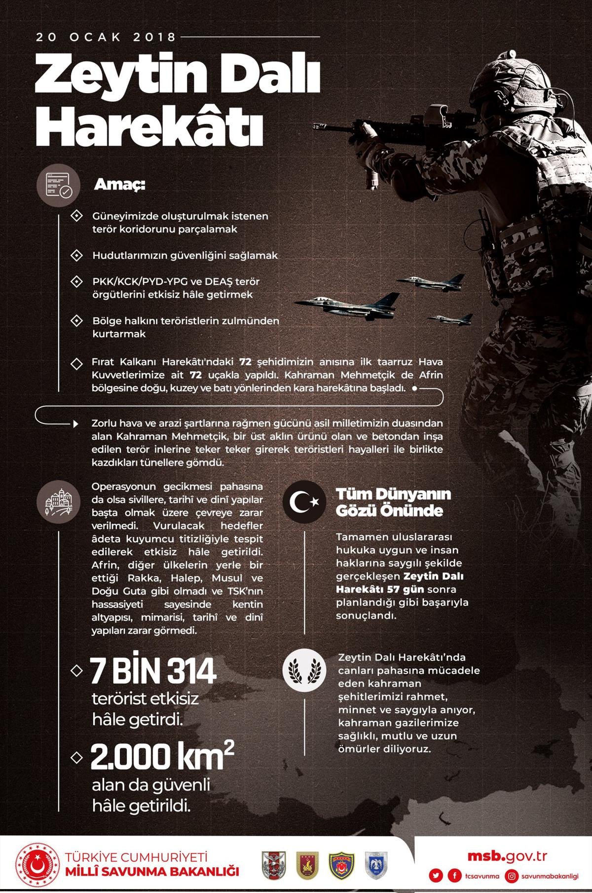 Tamamen uluslararası hukuka uygun ve insan haklarına saygılı şekilde gerçekleşen Zeytin Dalı Harekatı, 57 gün sonra planlandığı gibi başarıyla sonuçlandı.