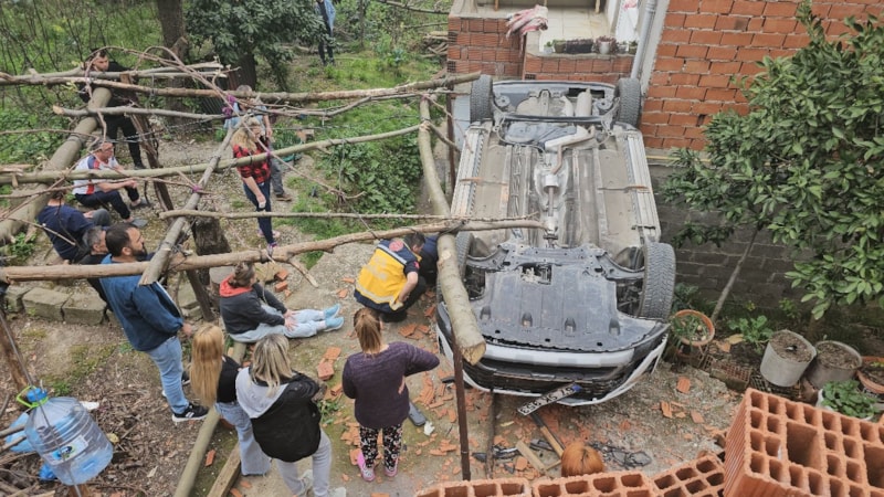 Kent merkezinde bir sürücü, evinin önünde aracını park etmeye çalışırken kontrolünü kaybederek 2 metre yükseklikten düştü. Araç ters dönerken sürücü hafif yaralandı.