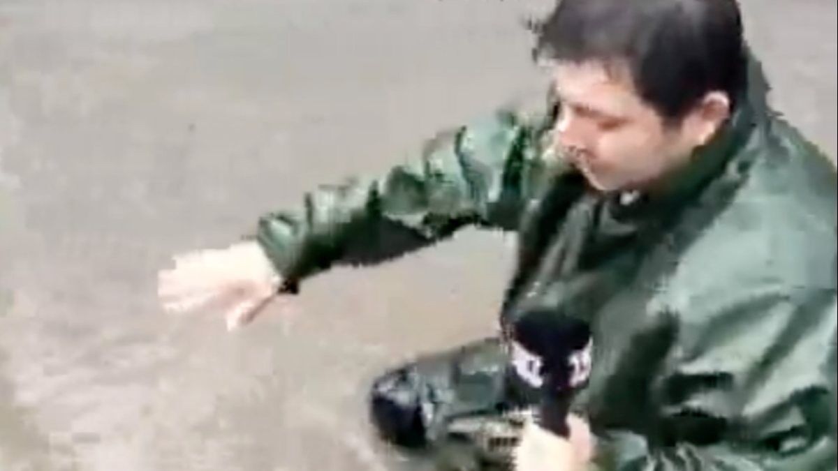 Sıcak gelişmeleri anlık olarak aktarmaya çalışan muhabir, bölgedeki yoğun su birikintisinin bulunduğu rögara düştü.
