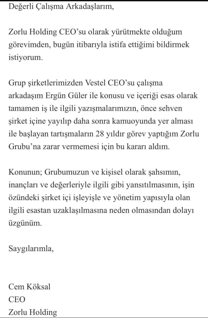 Grup şirketlerimizden Vestel CEO'su çalışma arkadaşım Ergün Güler ile konusu ve içeriği esas olarak tamamen iş ile ilgili yazışmalarımızın, önce sehven şirket içine yayılıp daha sonra kamuoyunda yer alması ile başlayan tartışmaların 28 yıldır görev yaptığım Zorlu Grubu'na zarar vermemesi için bu kararı aldım.