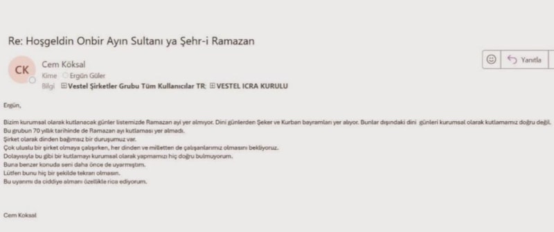 Ramazan ayı vesilesiyle şirket çalışanlarına gönderilen tebrik mesajına verdiği tepkiyle sosyal medyada büyük yankı uyandıran Zorlu Holding CEO'su Bekir Cem Köksal hakkında, "inanç, düşünce ve kanaat hürriyetinin engellenmesi" suçlamasıyla soruşturma başlatılmış ve gözaltına alınmıştı.