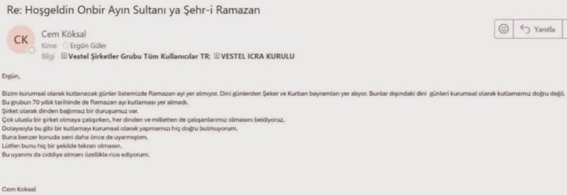 Vestel CEO'su Ergün Güler'in Ramazan tebriği paylaşımına, Zorlu Holding CEO'su Cem Köksal'dan tepki çeken bir yanıt geldi. Köksal, "Bu grubun 70 yıllık tarihinde Ramazan ayı kutlaması yok. Dinden bağımsız bir duruşumuz var." ifadelerini kullandı.