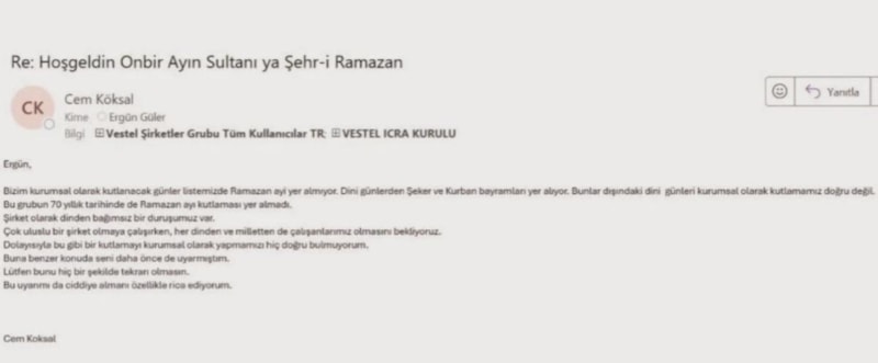 Bizim kurumsal olarak kutlanacak günler listemizde Ramazan ayı yer almıyor. Dini günlerden Şeker ve Kurban bayramları yer alıyor. Bunlar dışındaki dini günleri kurumsal olarak kutlamamız doğru değil. Bu grubun 70 yıllık tarihinde de Ramazan ayı kutlaması yer almadı. Şirket olarak dinden bağımsız bir duruşumuz var. Çok uluslu bir şirket olmaya çalışırken her dinden ve milletten de çalışanlarımız olmasını bekliyoruz. Buna benzer konuda seni daha önce de uyarmıştım. Lütfen bunu hiçbir şekilde tekrarı olmasın. Bu uyarımı da ciddiye almanı özellikle rica ediyorum.