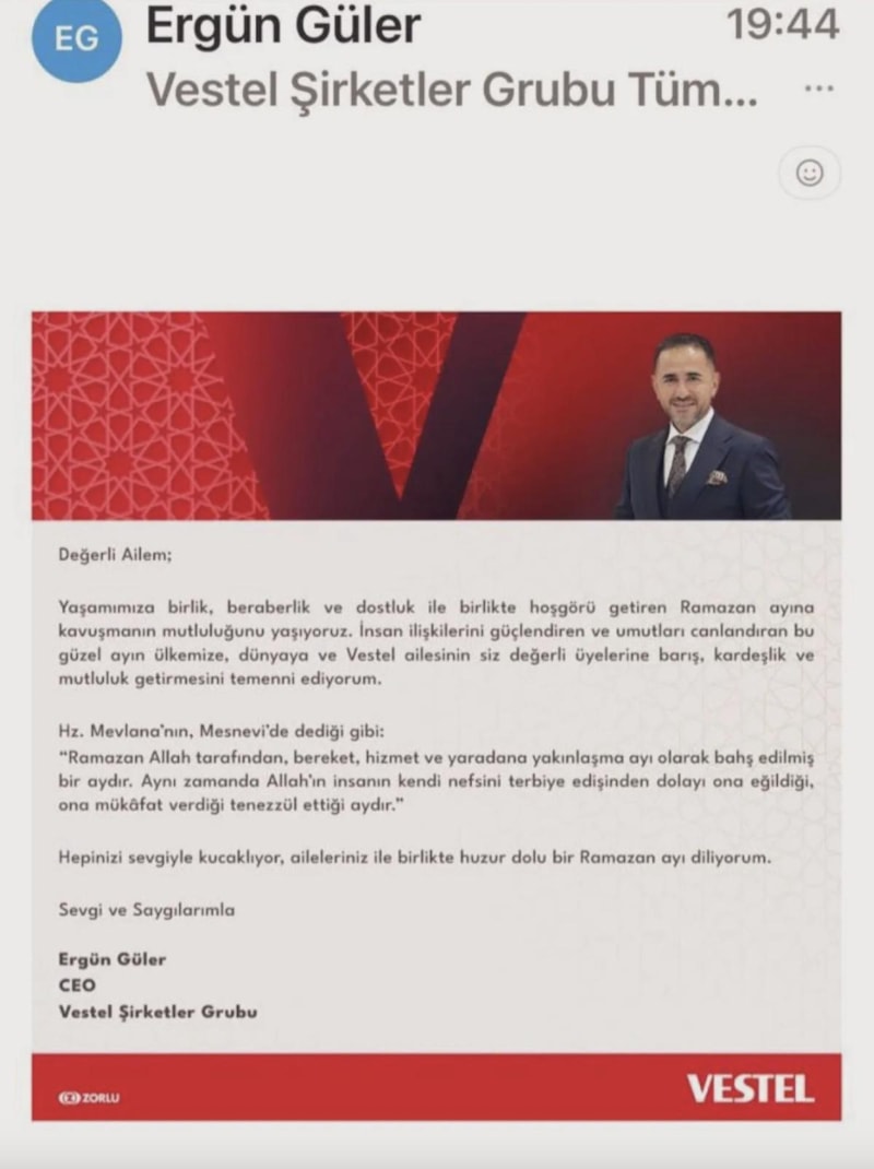 Vestel CEO'su Ergün Güler, Ramazan'ın başlaması nedeniyle çalışanlarına e-posta gönderdi.