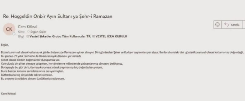 Bizim kurumsal olarak kutlanacak günler listemizde Ramazan ayı yer almıyor. Dini günlerden Şeker ve Kurban bayramları yer alıyor. Bunlar dışındaki dini günleri kurumsal olarak kutlamamız doğru değil. Bu grubun 70 yıllık tarihinde de Ramazan ayı kutlaması yer almadı. Şirket olarak dinden bağımsız bir duruşumuz var. Çok uluslu bir şirket olmaya çalışırken her dinden ve milletten de çalışanlarımız olmasını bekliyoruz. Buna benzer konuda seni daha önce de uyarmıştım. Lütfen bunun hiçbir şekilde tekrarı olmasın. Bu uyarımı da ciddiye almanı özellikle rica ediyorum.
