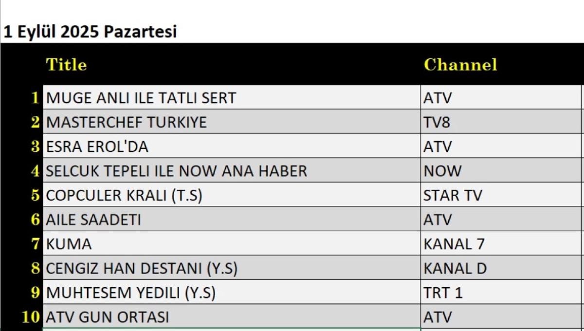 - 1 Eylül 2025 günü reyting sonuçlarına göre, zirvenin sahibi Müge Anlı ile Tatlı Sert oldu.