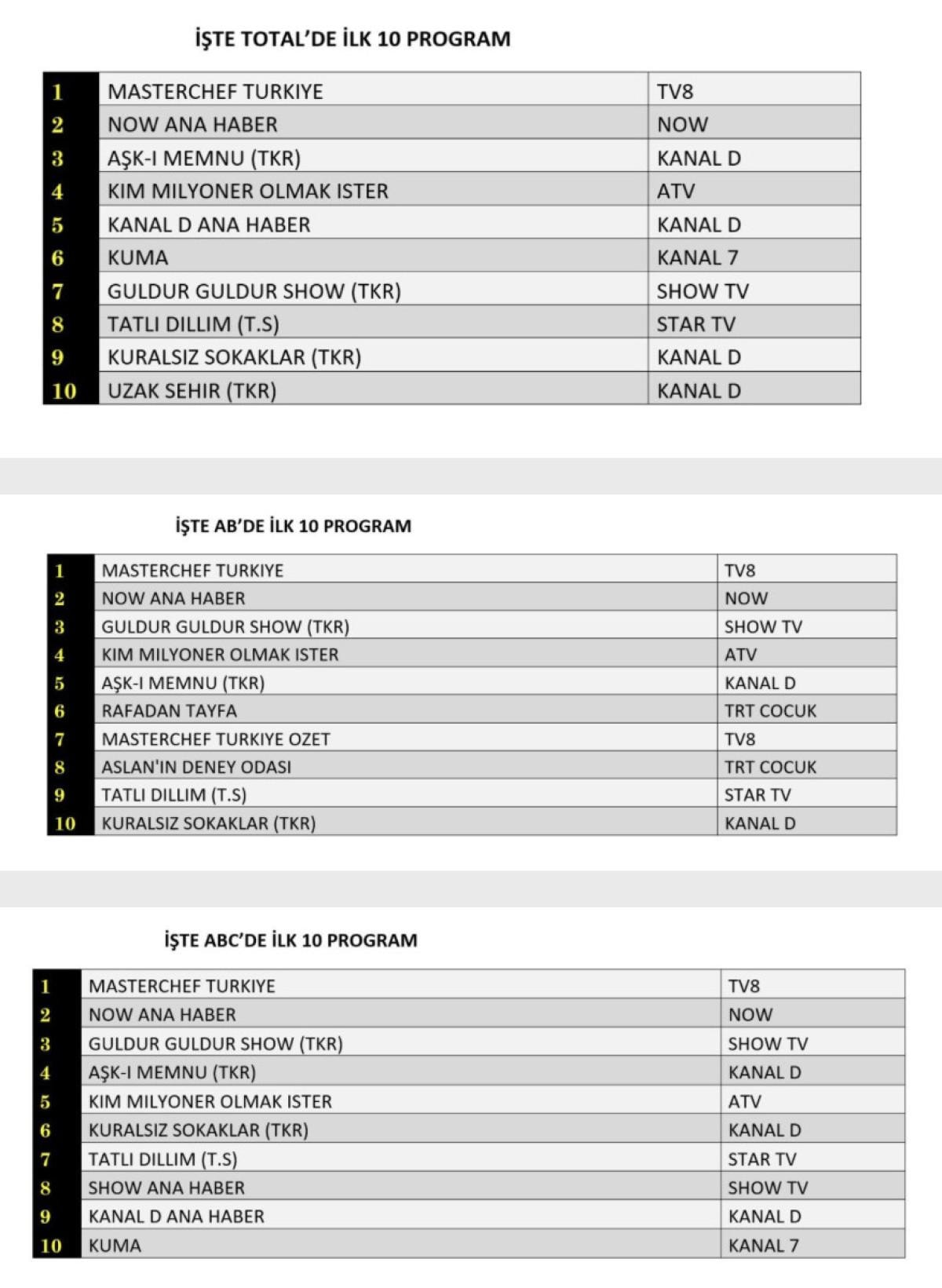ABC kategorisinde ise birinci sırayı “Masterchef Türkiye” programı elde etti. İkinci sırada “NOW Ana Haber” karşılaşması, üçüncü sırada ise “Güldür Güldür Show (tekrar)” yer aldı.