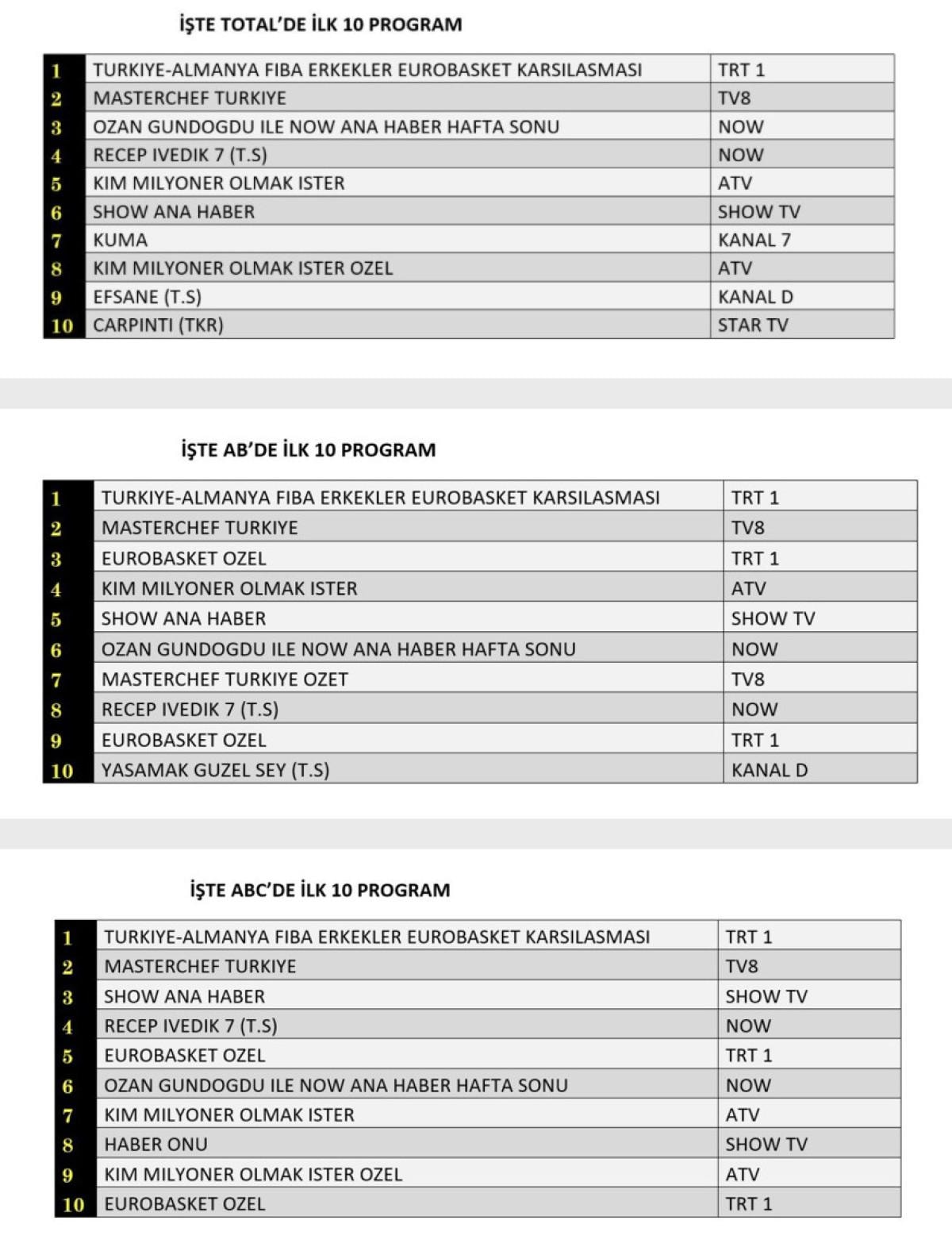 ABC kategorisinde 1. sırada “Türkiye-Almanya FIBA Erkekler Eurobasket Karşılaşması”, 2. sırada “Masterchef Türkiye”, 3. sırada “Show Ana Haber” yer aldı.