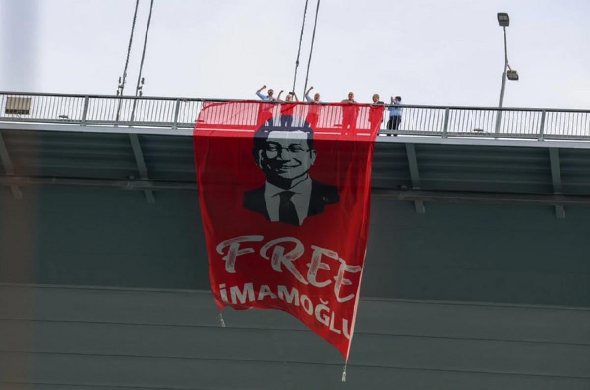 Pankartta İmamoğlu'nun silueti yer alırken üzerinde “Free İmamoğlu” yazısı dikkat çekti.