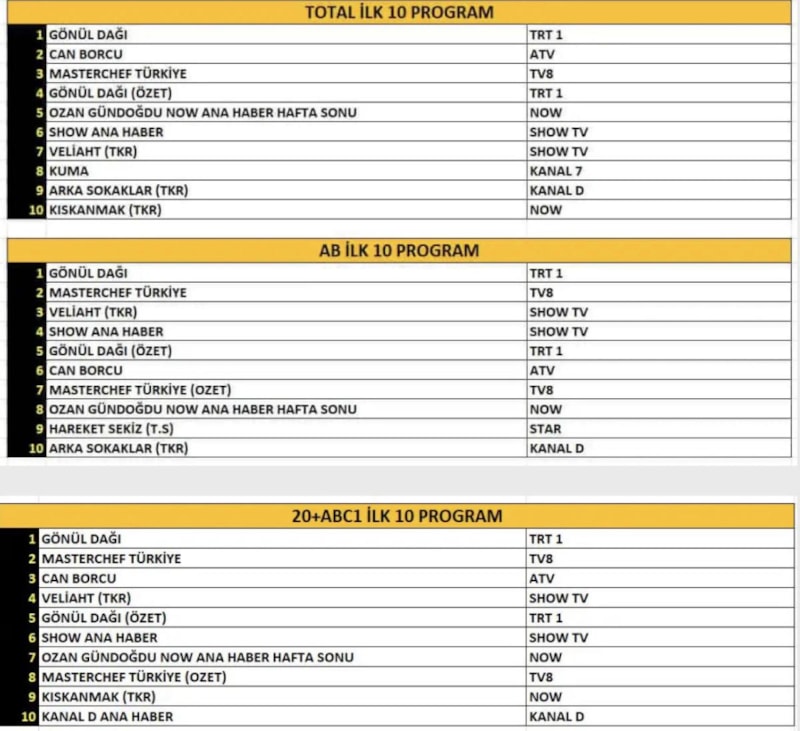 Total’de 1. sırada TRT 1’de izleyici ile buluşan “Gönül Dağı”, 2. sırada ATV’de ekranlara gelen “Can Borcu” , 3. sırada ise TV8’de yayınlanan “MasterChef Türkiye” yer aldı.