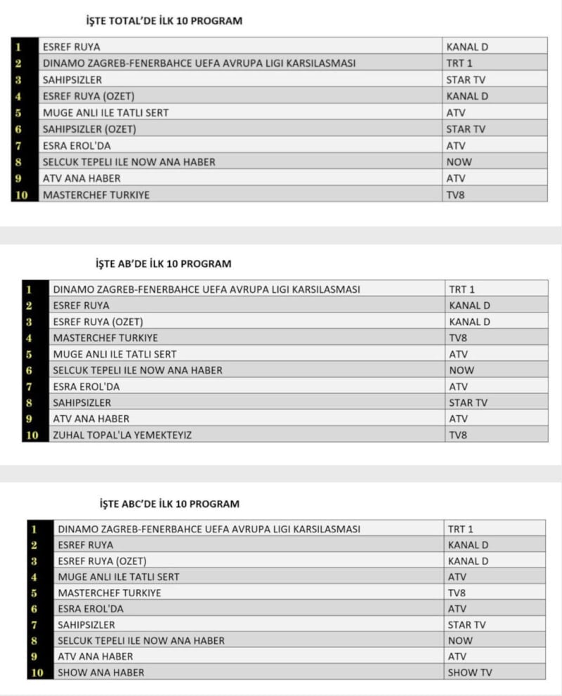 Her gün bir önceki güne ait Total, AB ve ABC sıralaması belli olurken dünün reyting sonuçları merakla bekleniyor.