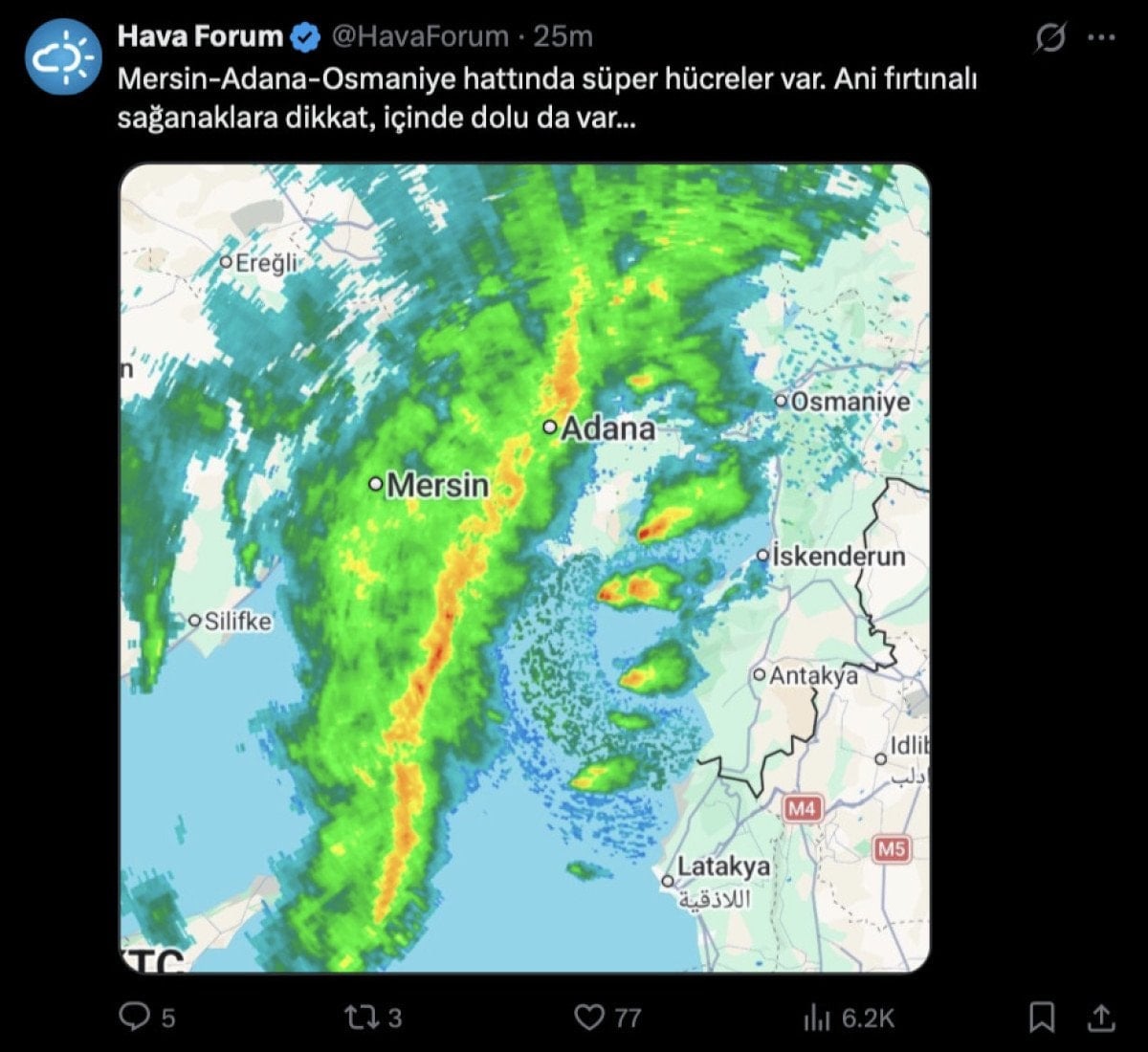Uyarısında, “Mersin-Adana-Osmaniye hattında süper hücreler var. Ani fırtınalı sağanaklara dikkat, içinde dolu da var…” ifadelerini kullandı.