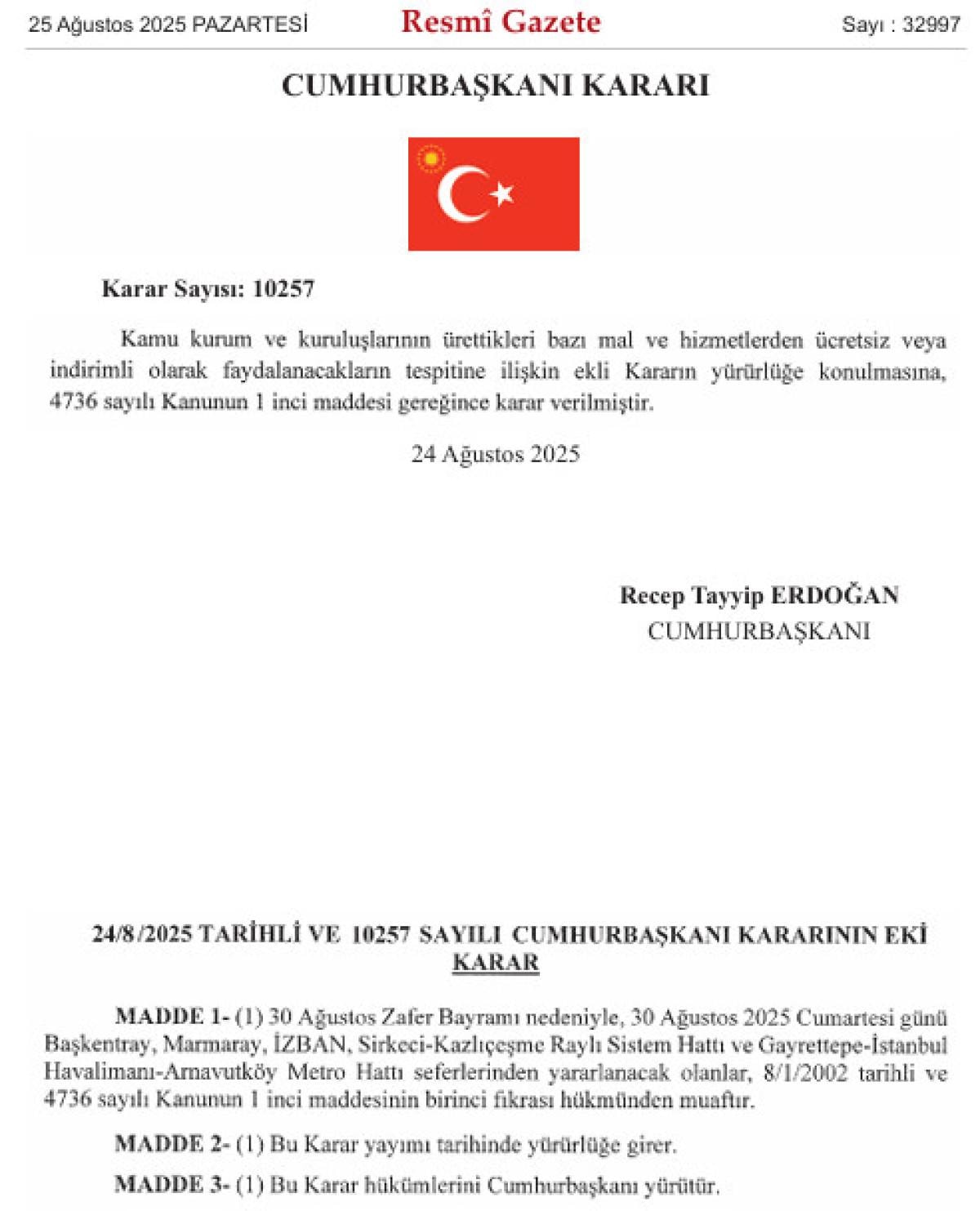 Buna göre; İstanbul'da Marmaray ile Gayrettepe-İstanbul Havalimanı Metrosu, Ankara'da Başkentray, İzmir'de İZBAN seferleri 30 Ağustos'ta ücretsiz olacak.