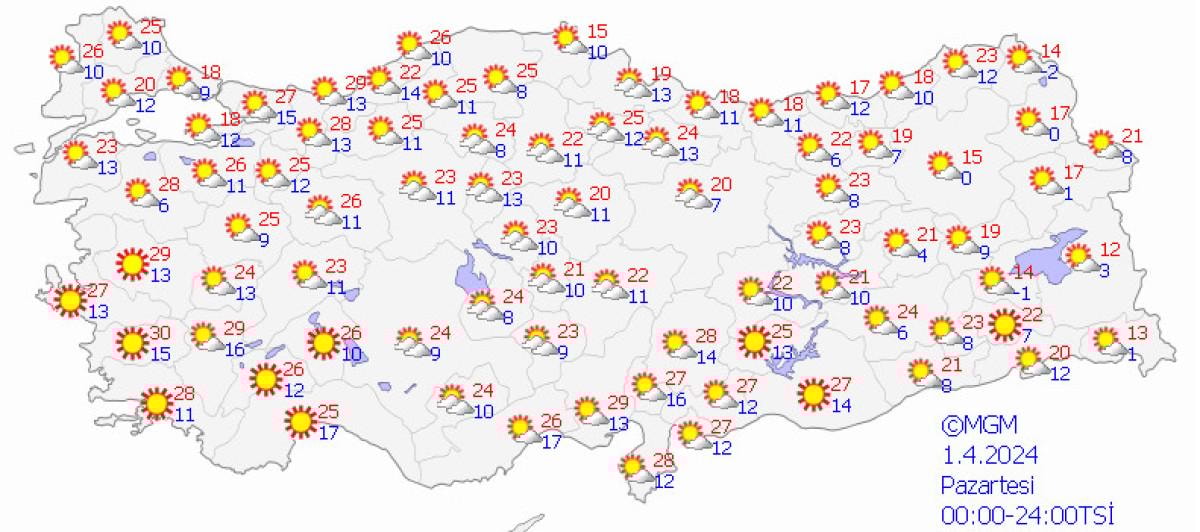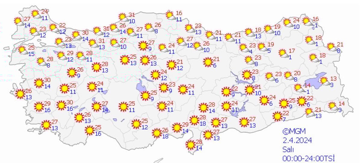 31 Mart Pazar günü, yağış tahmin edilmiyor. Sıcaklık değerleri, Ankara'da 23 derece, İstanbul'da 19 derece ve İzmir'de ise 26 derece civarında seyredecek.