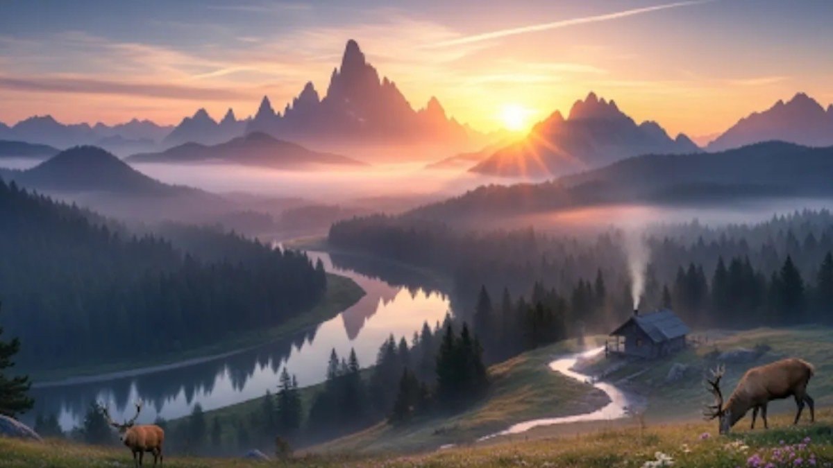 Arka planda, kısmen sisle kaplı belirgin, pürüzlü dağlar var. Ön planda, kır çiçekleriyle noktalı çimenli arazide otlayan iki geyik yer alıyor.
