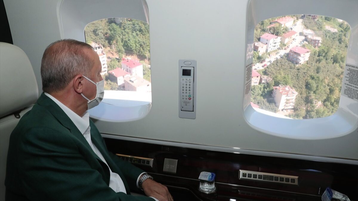 Erdoğan, helikopter ile sel felaketinin yaşandığı Giresun'un Dereli ilçesinden havadan incelemelerinin ardından, vatandaşlarla sohbet etti.