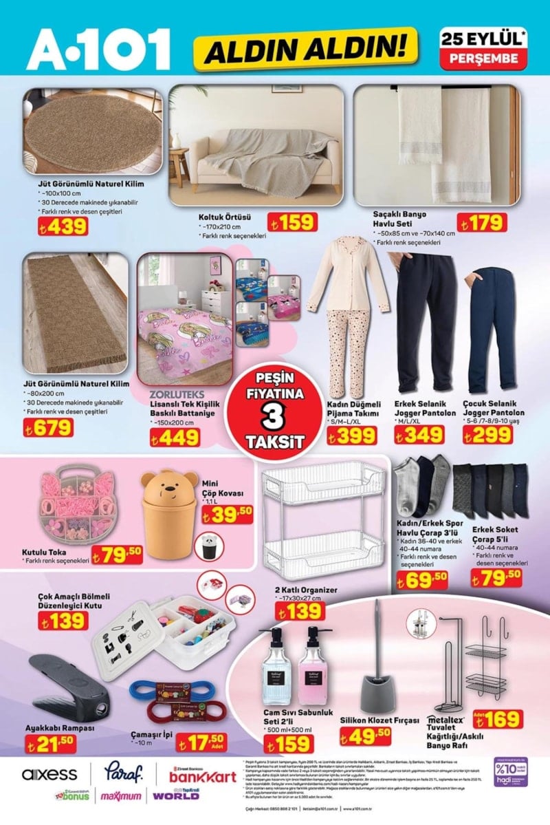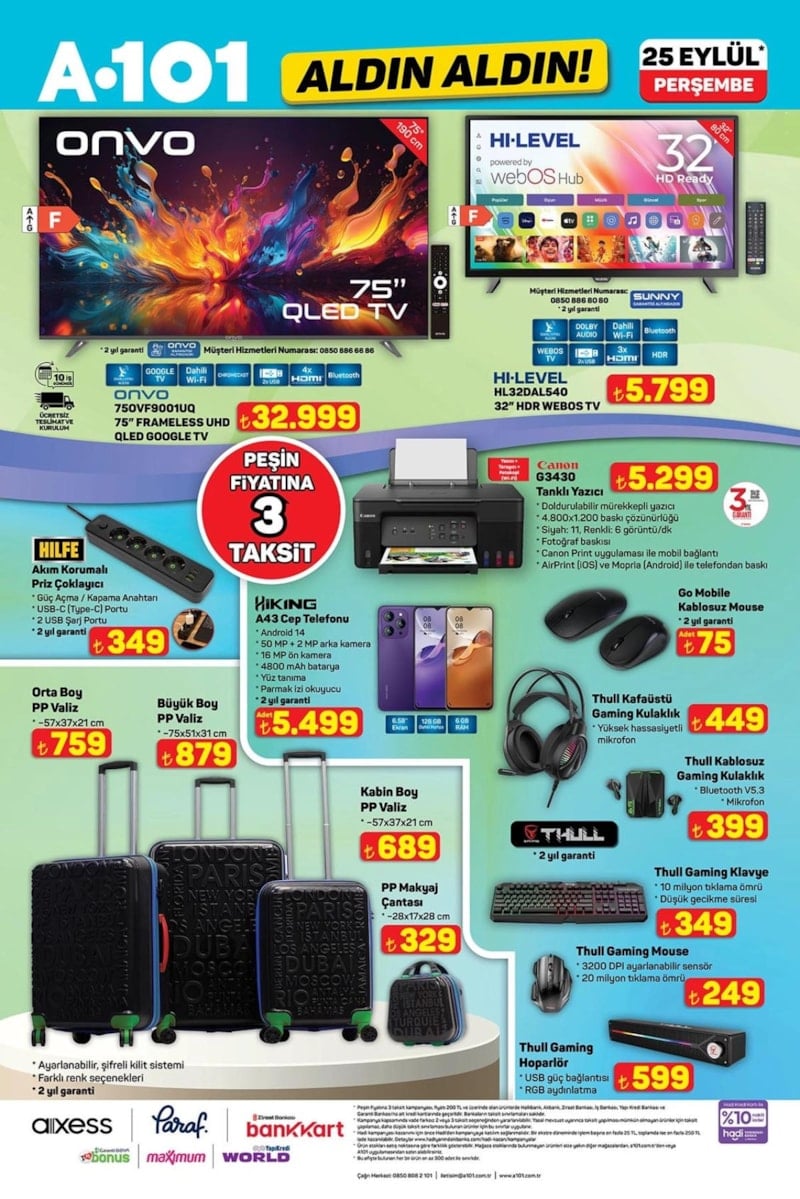 A101, 25 Eylül 2025 haftası için hazırladığı aktüel katalog listesini duyurdu. Aldın Aldın kampanyası kapsamında sunulan indirimler, ev ve teknoloji ürünlerinde avantajlı fırsatlar sağlıyor. İşte A101 25 Eylül aktüel...