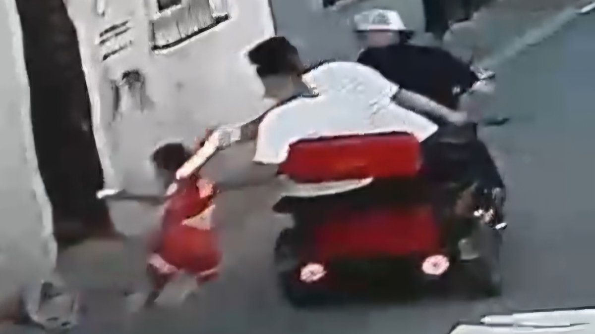 Çocuğun yanına elektrikli triportör ile yaklaşan 3 kişi, çocuğu üzerindeki Galatasaray formasından tutup, 2 metre sürükledikten sonra hızla uzaklaştı.