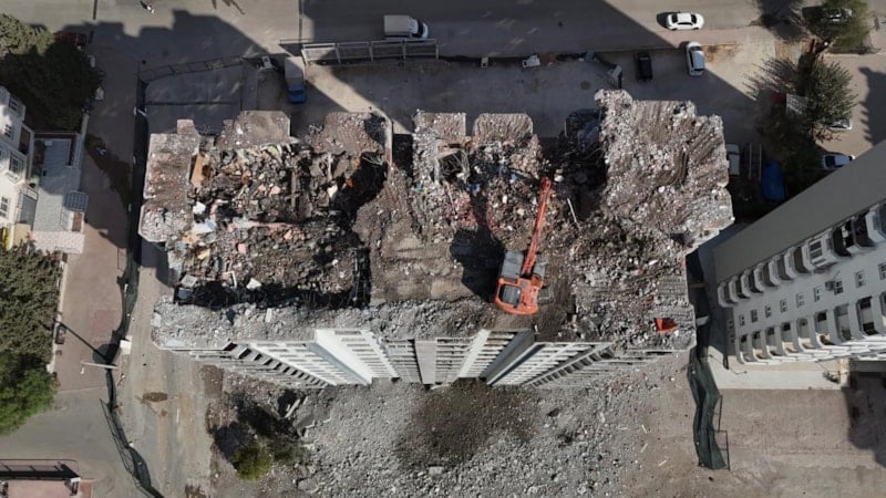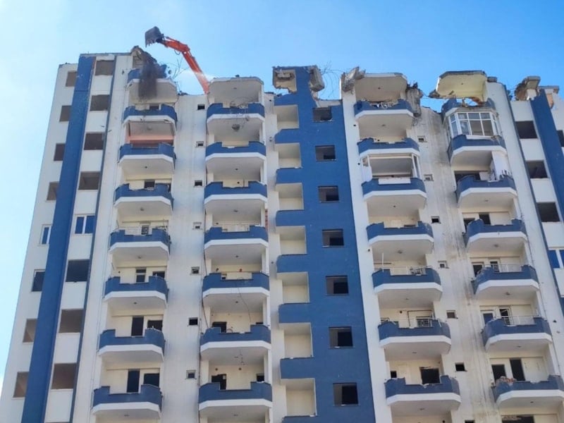 15 katlı apartmanın damına çıkarılan iş makinesi, etrafın toz olmaması için sulama yapılarak kat kat yıkımı gerçekleştirdi.