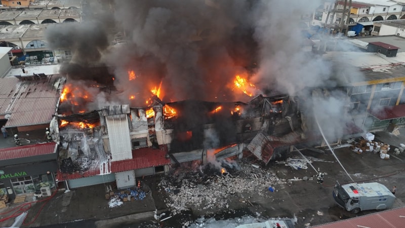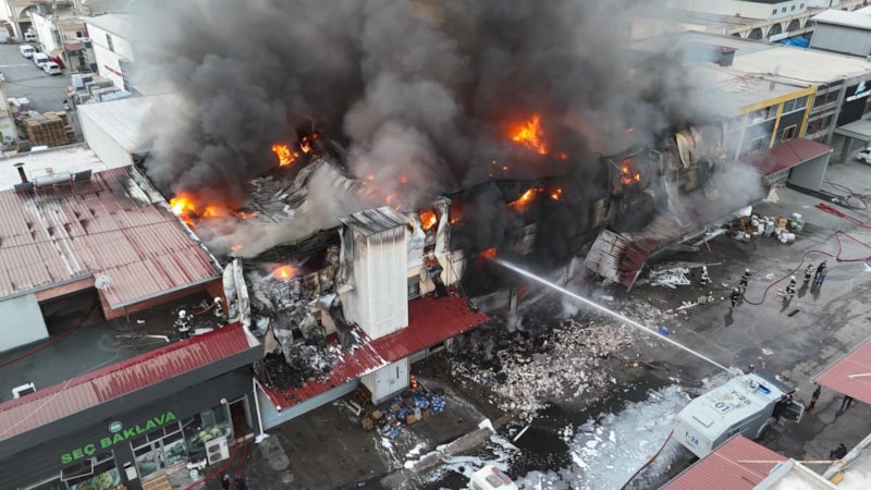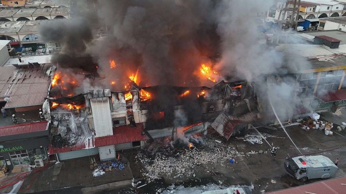 Bitişik iş yerlerine de sıçrayan yangını söndürme çalışmaları sürerken yangın, drone ile havadan görüntülendi.