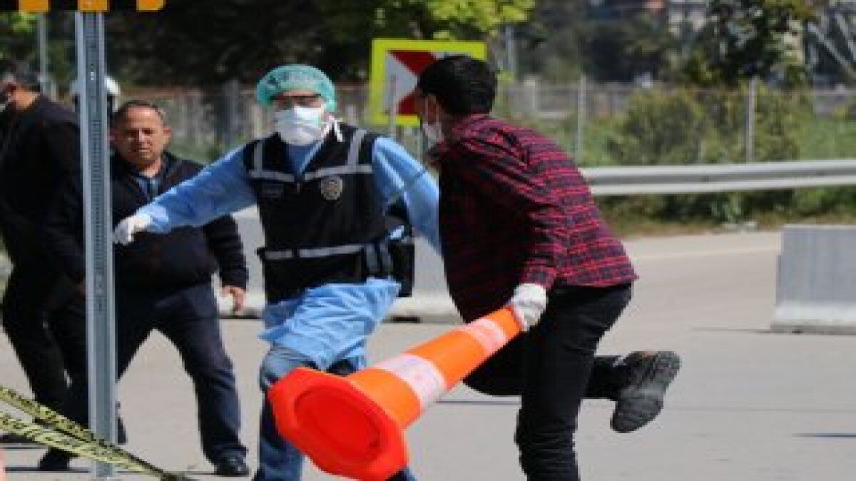 Şahıs, otoban çıkışının yanına geldiğinde burada önünü kesen polis ekiplerine rağmen cam parçasını boynunda tutup, direnmeye devam etti.