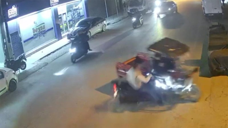 Görüntüde motosikletin üç tekerlekli motosiklete çarptıktan sonra sürücünün yere düşmesi yer alıyor.