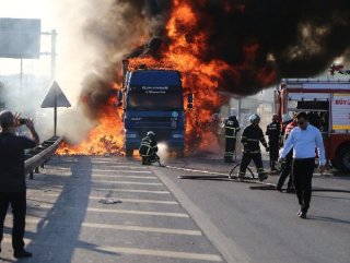 Arka lastiklerinin, patlaması sonucu çıktığı ileri sürülen tırın şoförü, yangını fark edince güvenlik şeridine çekip, itfaiyeyi aradı.
