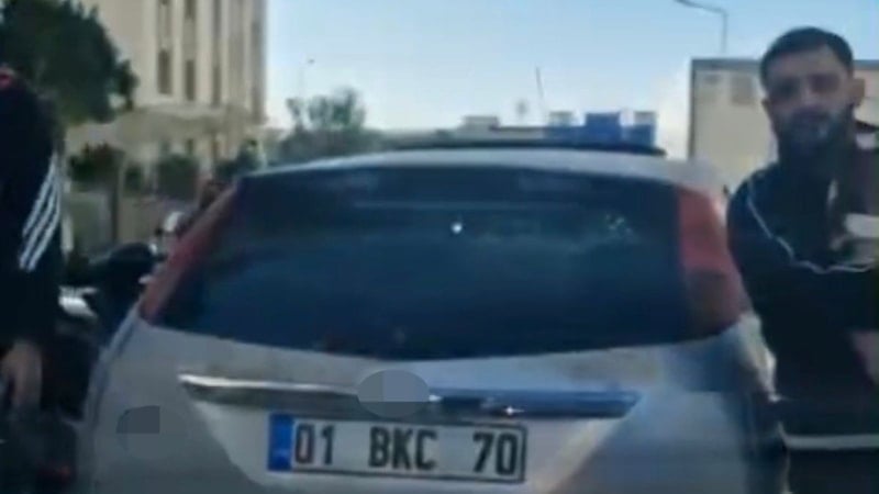 Adana'da trafikte yol verme meselesi nedeniyle çıkan tartışmada içinde ailenin bulunduğu otomobilin önü 3 kişi tarafından kesilirken, şüphelilerden biri aracın camına defalarca vurup kapı kolunu kırdı.
