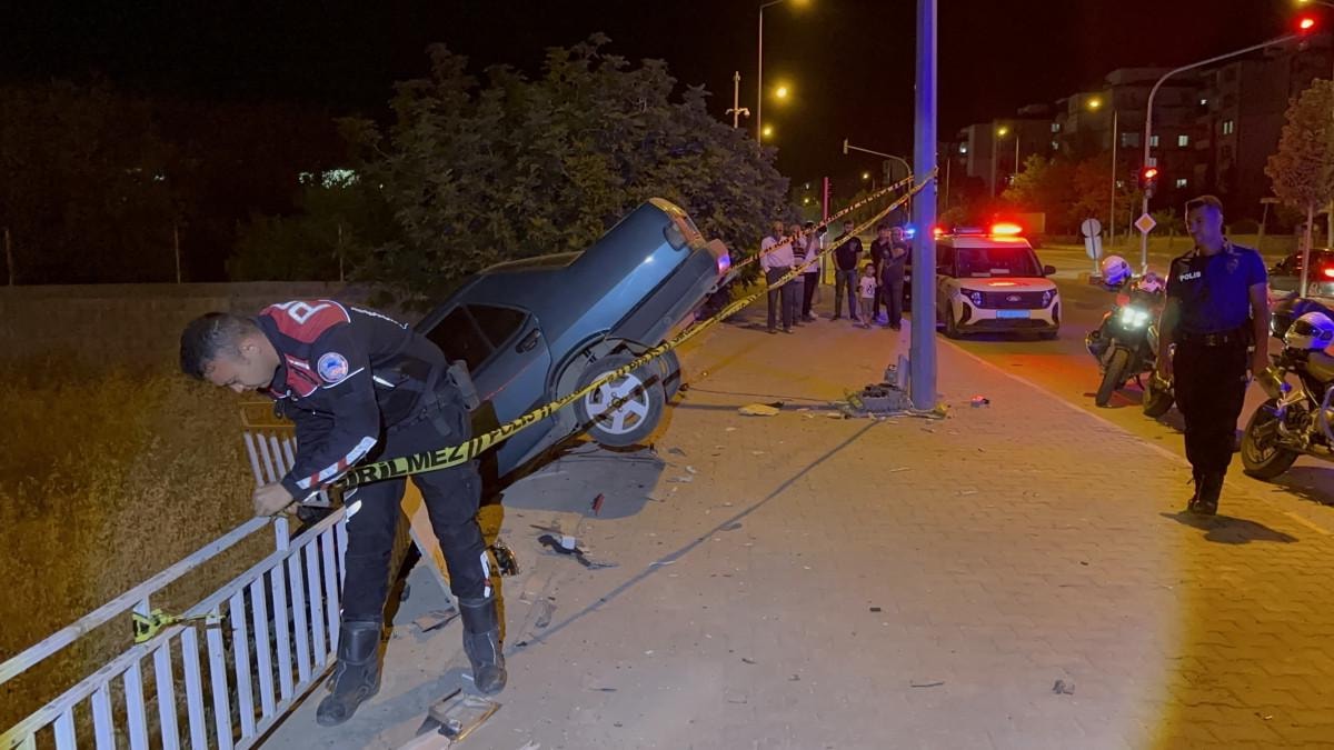 Kaldırımdaki elektrik panosuna çarpan otomobil, tarlaya düşmek üzereyken kaldırım kenarında askıda kaldı.