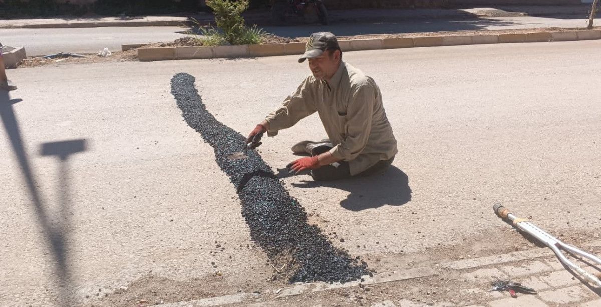Gelen hazır asfaltı alan Bünyamin Dağlılar, koltuk değnekleri ile kazaların yaşandığı noktaya gelerek burada elinde mala ile yola kasis yaptı.