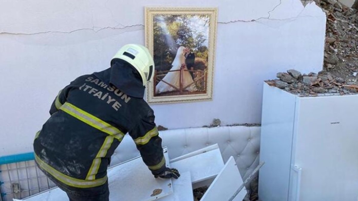 Yerle bir olmuş evin duvarında düğün fotoğrafı