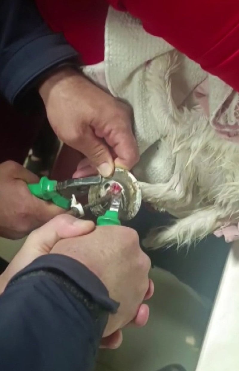 Ayağına takılı kalan parça ile birlikte kediyi itfaiyeye götüren vatandaş, ekiplerden yardım istedi.