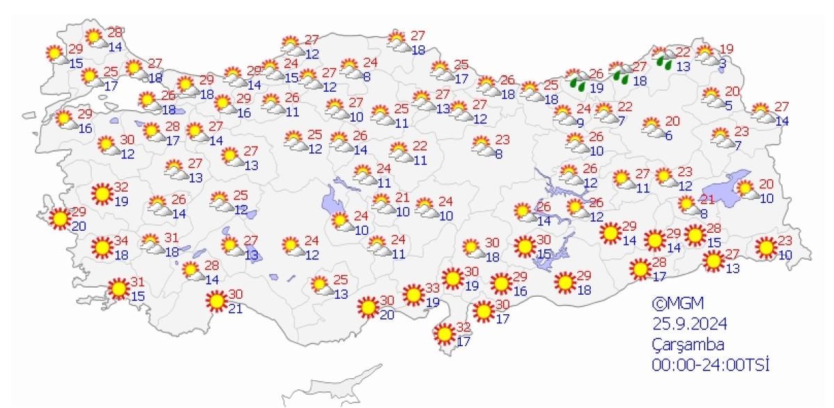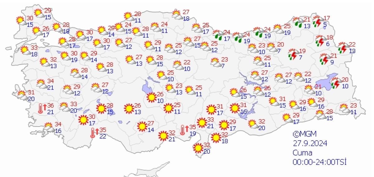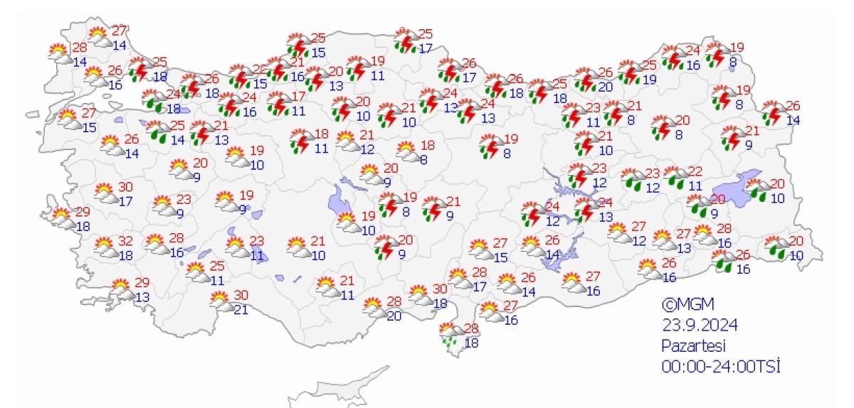 Gece saatlerinden itibaren; Düzce çevreleri ile Sakarya'nın doğu, Bolu ve Karabük'ün kuzey kesimlerinde kuvvetli, Bartın ve Zonguldak çevrelerinde çok kuvvetli ve yer yer şiddetli, Trabzon il genelinde aralıklarla ve yer yer kuvvetli sağanak ve gök gürültülü sağanak yağış bekleniyor.