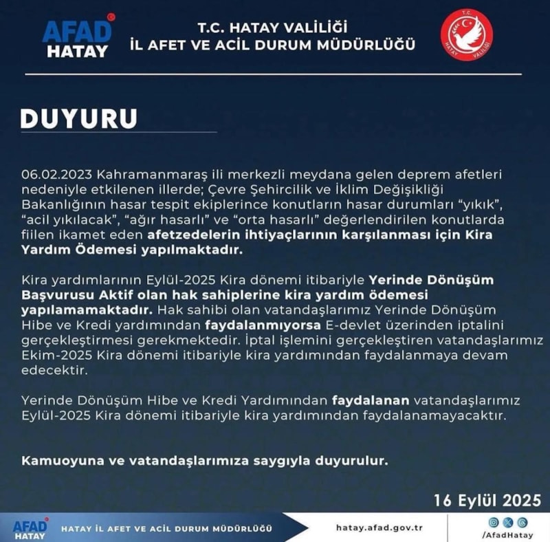 Öte yandan, Yerinde Dönüşüm Hibe ve Kredi desteğinden yararlanan vatandaşlara ise, Eylül 2025 itibarıyla kira yardımı ödemesi yapılmayacağı açıkça belirtildi.