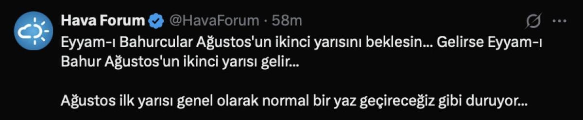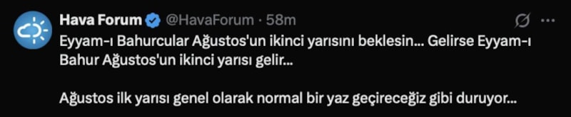 “Eyyam-ı Bahurcular Ağustos'un ikinci yarısını beklesin... Gelirse Eyyam-ı Bahur Ağustos'un ikinci yarısı gelir... Ağustos ilk yarısı genel olarak normal bir yaz geçireceğiz gibi duruyor…”