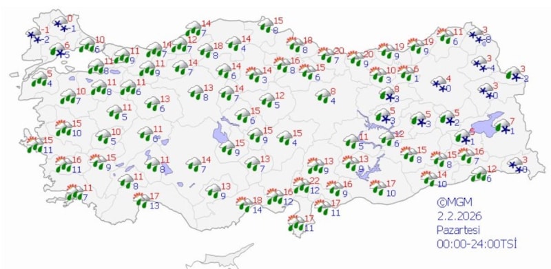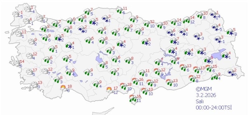 Meteoroloji Genel Müdürlüğü'nün (MGM) verilerine göre bugün Trakya, Doğu Karadeniz’in iç kesimleri ile Doğu Anadolu’da karla karışık yağmur ve kar yağışının devam edeceği öngörülüyor.